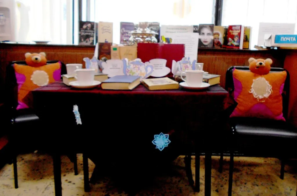 Интерьер внутри библиотеки тоже преобразился. Оформлена фотозона и уютный уголок для чтения – самовар с горячим чаем и сладостями.