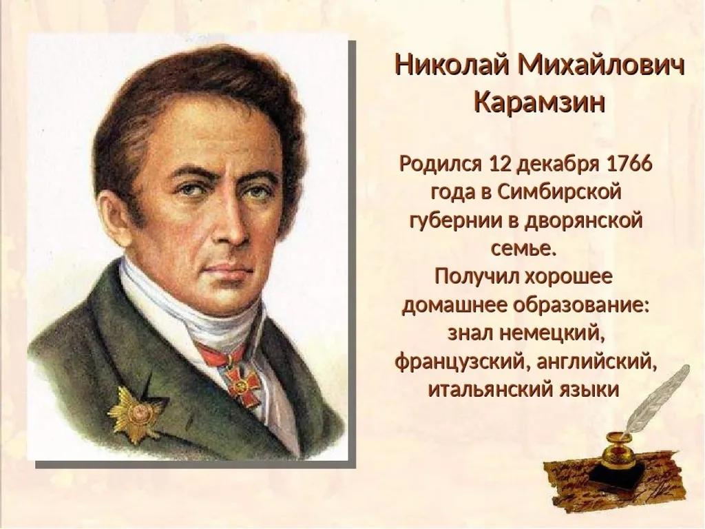 12 декабря 1766 года родился Николай Михайлович Карамзин историк, крупнейший русский литератор эпохи сентиментализма, прозванный «русским Стерном». Создатель «Истории государства Российского» (тома 1—12, 1803—1826) — одного из первых обобщающих трудов по истории России. Редактор «Московского журнала» (1791—1792) и «Вестника Европы» (1802—1803). Действительный статский советник. Карамзин вошёл в историю как реформатор русского литературного языка.
