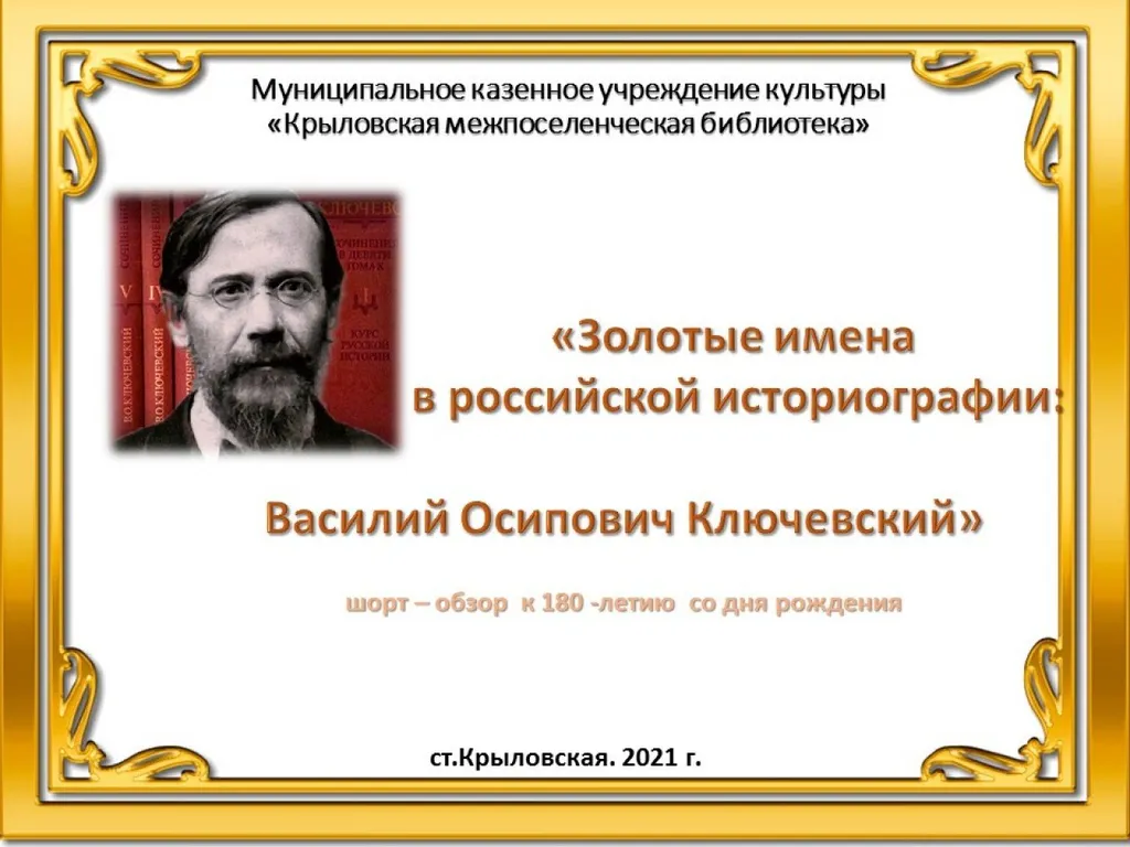28 января 2021 года исполняется 180 лет со дня рождения Василия О́сиповича Ключе́вского, русского историка, профессора Московского университета, заслуженного профессора Московского университета; ординарного академика Императорской Санкт-Петербургской академии наук по истории и древностям русским , председателя Императорского Общества истории и древностей российских при Московском университете, тайного советника.
