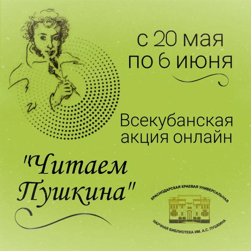 Сегодня 20 мая стартует Всекубанская акция «Читаем Пушкина-2020», проводимая по инициативе Краснодарской краевой универсальной научной библиотеки им.А.С.Пушкина. Впервые она пройдет в режиме онлайн. В ней могут принять все, кто любит творчество великого русского поэта и писателя,истинного гражданина родной земли. Это можно сделать не выходя из дома. Достаточно снять небольшой ролик чтения любимого произведения А.С.Пушкина и разместить в любой социальной сети под хештегом #читаемПушкина_2020 или прислать на электронную почту Крыловской межпоселенческой библиотеки krlmb07@rambler.ru и мы разместим его на страничке библиотеки в сети .