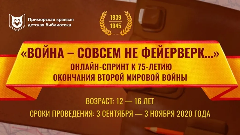 Специалисты Приморской краевой детской библиотеки подготовили онлайн-спринт «Война – совсем не фейерверк», посвящённый 75-летию окончания Второй мировой войны. Он стартовал 3 сентября, а завершится 3 ноября 2020 года.