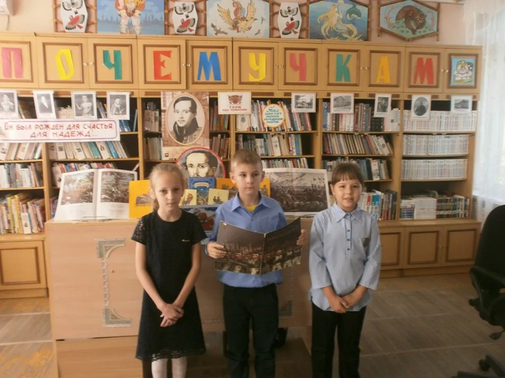 В середине октября в Районной детской библиотеке отмечался юбилей (205 лет) со дня рождения М.Ю. Лермонтова. На базе клуба «Всё обо всём», в литературно - экскурсионное бюро «Недаром помнит вся Россия…», посвящённое жизни и творчеству великого русского поэта, были приглашены ребята 3 – 4 классов СОШ №2. М. Ю. Лермонтов не писал произведений специально для детей. И всё же школьная практика показывает, что знакомиться с его произведениями дети начинают уже с начальных классов. Поэтому, подготовленные к литературной теме ребята: прочитав восточную сказку «Ашик – Кериб» и выучив наизусть стихотворение «Бородино», пришли в библиотеку. Здесь их ждали несколько литературных экскурсий: по биографии поэта, по истории создания сказки « Ашик – Кериб» и стихотворению «Бородино», ну, и, конечно, всеми любимые викторины по прочитанным произведениям, которые помогли выявить литературных лидеров.