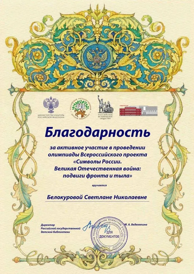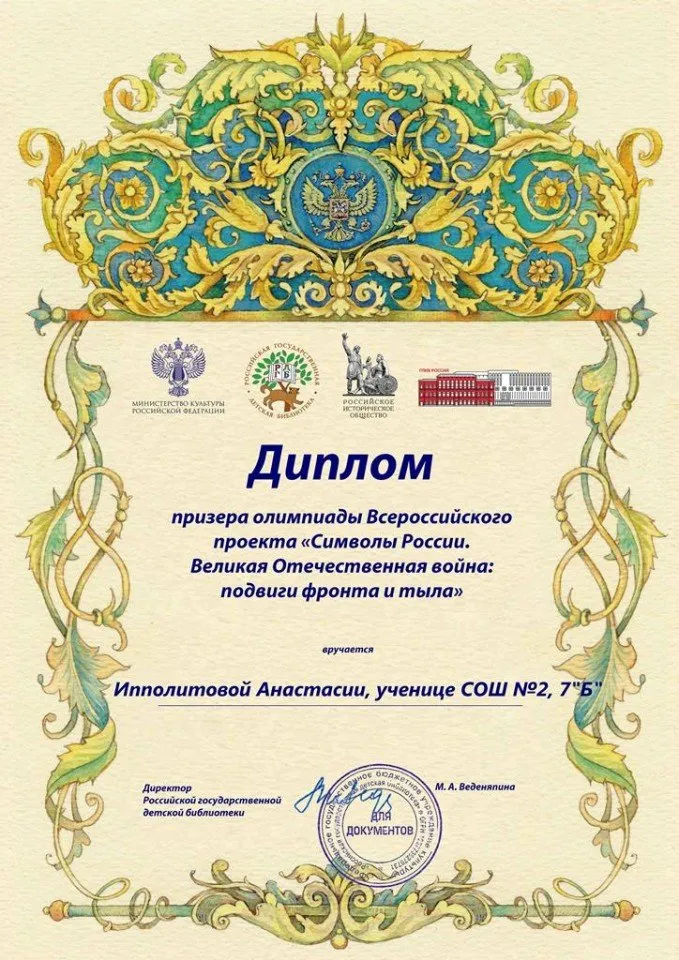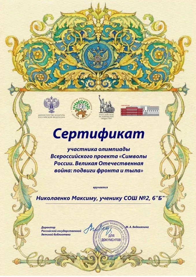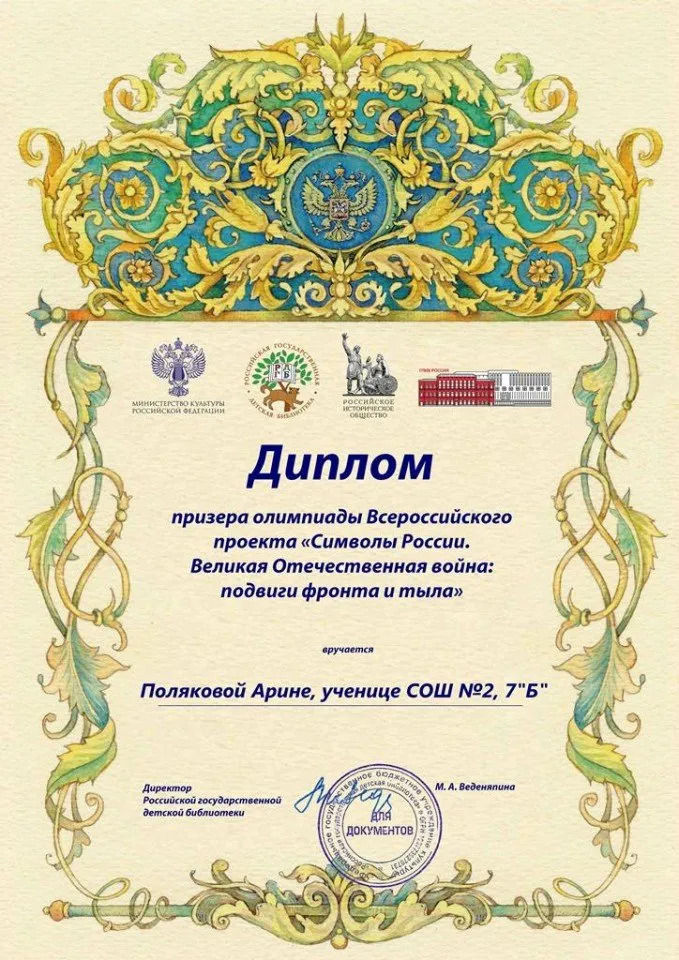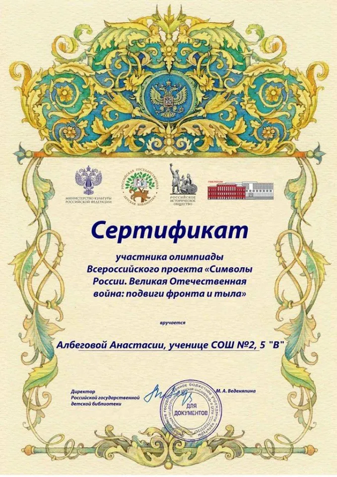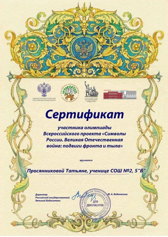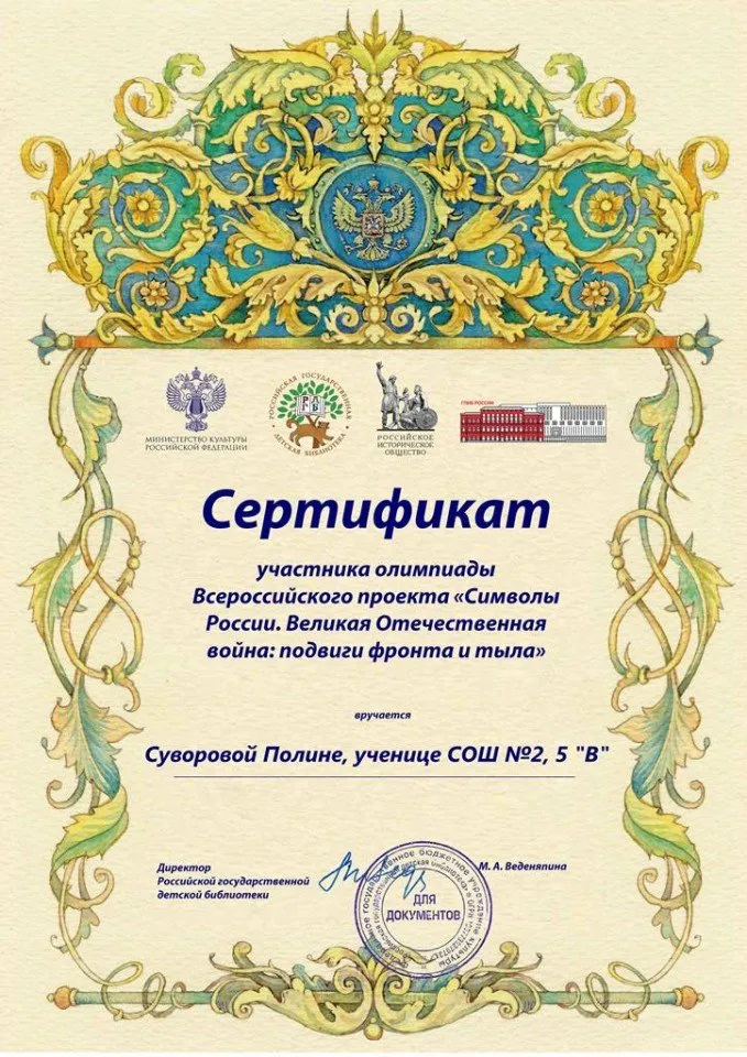 Ребята 5-7 классов СОШ №2 приняли участие во Всероссийской Олимпиаде «Символы Победы. Великая Отечественная война: подвиги фронта и тыла», организованной Российской государственной детской библиотекой.