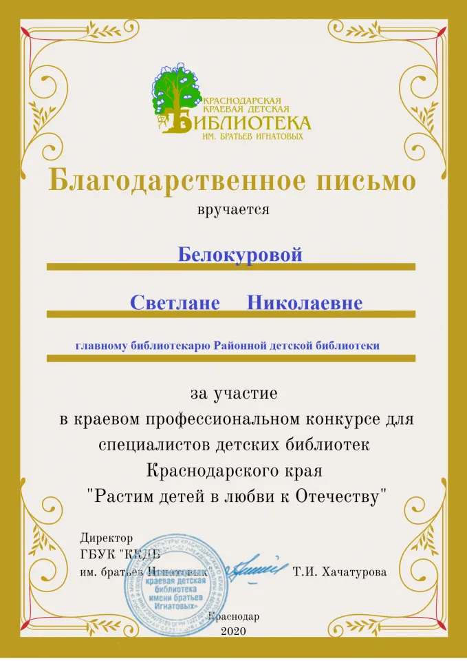 Грамота за участие в профессиональном конкурсе для специалистов детских библиотек Краснодарского края «Растим детей в любви к Отечеству».