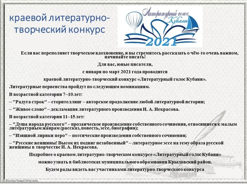 С января по март 2021 года приглашаем ребят в возрасте от 7 до 15 лет принять участие в краевом литературно-творческом конкурсе "Литературный голос Кубани", муниципальный этап которого проходит в библиотеках муниципального образования Крыловский район .